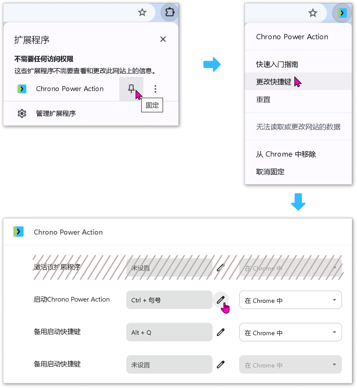 2. 你也可以使用默认快捷键 Ctrl + 句号 或 Alt + Q 来启动CPA。 你可以在 chrome://extensions/shortcutsedge://extensions/shortcuts 页面更改这些按键 (如有冲突的话)。